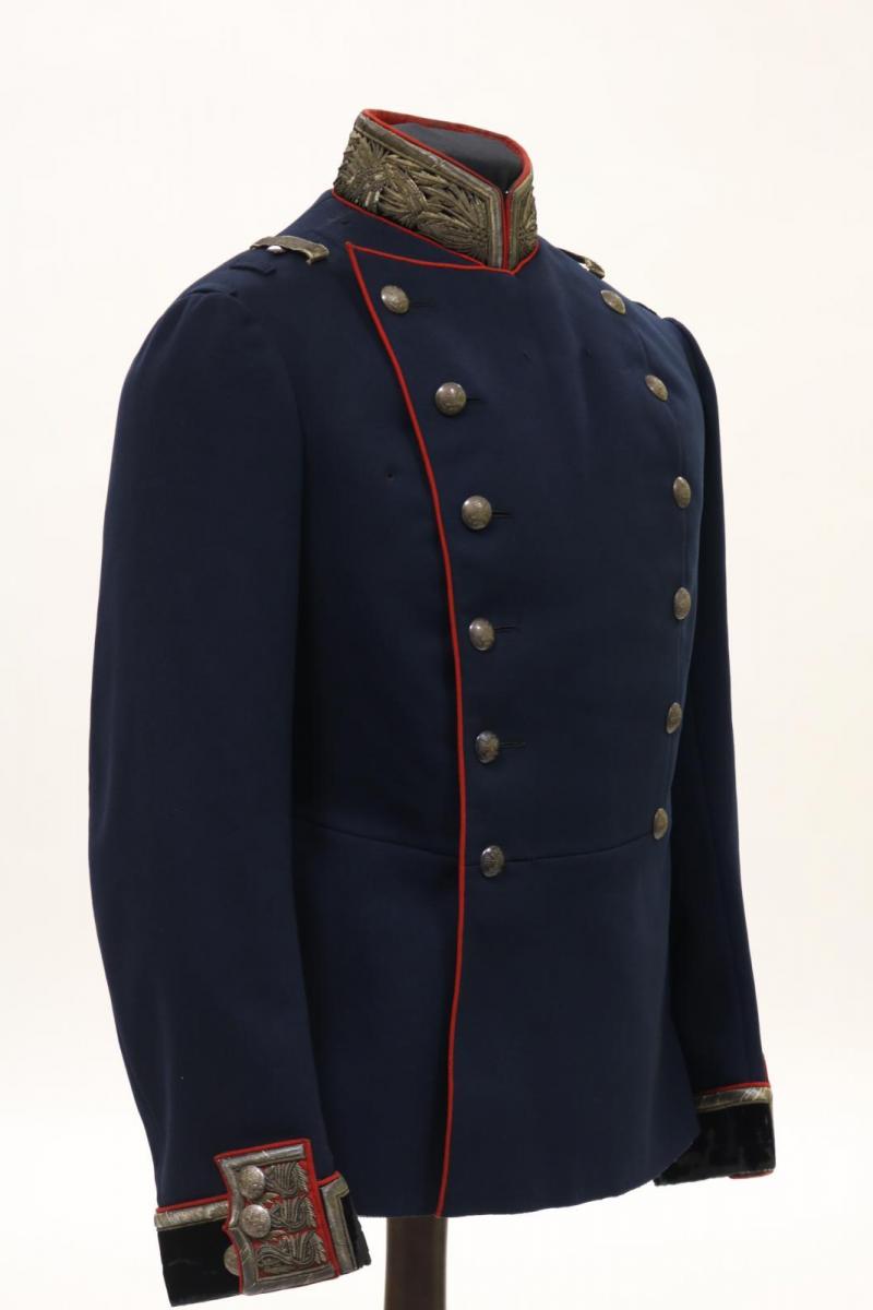 Зимовий парадний мундир офіцера Генерального штабу. Мундир був встановлений в 1907 році у рамках реформи військової форми одягу, під час якої була замінені мундири спрощеної "народної форми" часів попереднього царювання, які застібалися на гачки та були непоказного зовнішнього вигляду. Мундири зразка 1907 року загалом наслідували зразки військової форми одягу зразка 1855 року. Мундир виготовлений із сукна, двобортний, із застібкою на 6 гудзиків, у офіцерів позолочених. Приналежність до Генерального штабу вказують комір та обшлаги з чорного оксамиту з шиттям.