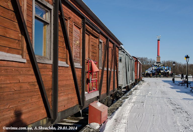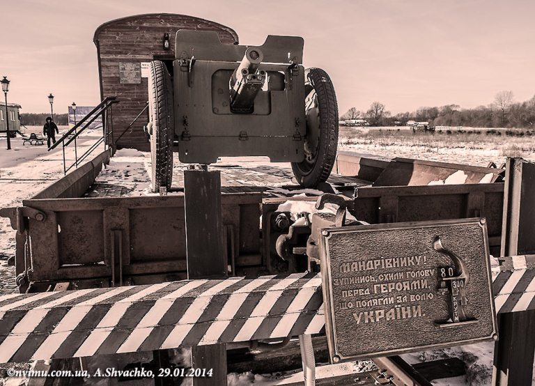 Навпроти монумента відтворено залізничний перон Києва поч. ХХ ст. З обох боків перону на коліях розташовані 7 старовинних залізничних вагонів, подібних до тих, на яких їхали на фронт учасники бою. Експозиція розпочинається з відкритої залізничної платформи з гарматою. З такої гармати, укріпленої мішками з піском, сотник армії УНР Лощенко вів прицільний вогонь по наступаючих лавах червоноармійців.
